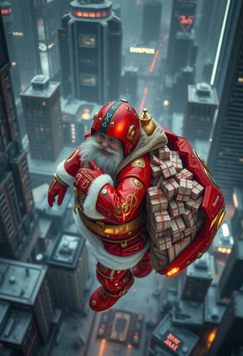 A dramatic high-angle shot focuses on the intricate details of a sleek, cheerful red steampunk jet-powered exosuit, gliding silently through a snow-kissed, steampunk metropolis. The exosuit, adorned with brass and steel accents, is bathed in a soft, ethereal glow. A portly, white-bearded figure, a futuristic Santa Claus, is partially obscured by the exosuit, carrying a high-tech bag of toys filled with countless wrapped gifts. The city, a labyrinth of towering skyscrapers and neon-lit alleyways, stretches out below, a stark contrast to the traditional Christmas scene. The hyper-realistic image should capture the steampunk aesthetic, with a focus on the intricate details of the exosuit and the futuristic cityscape. The image should have a shallow depth of field, emphasizing the exosuit and blurring the background, creating a sense of mystery and wonder.