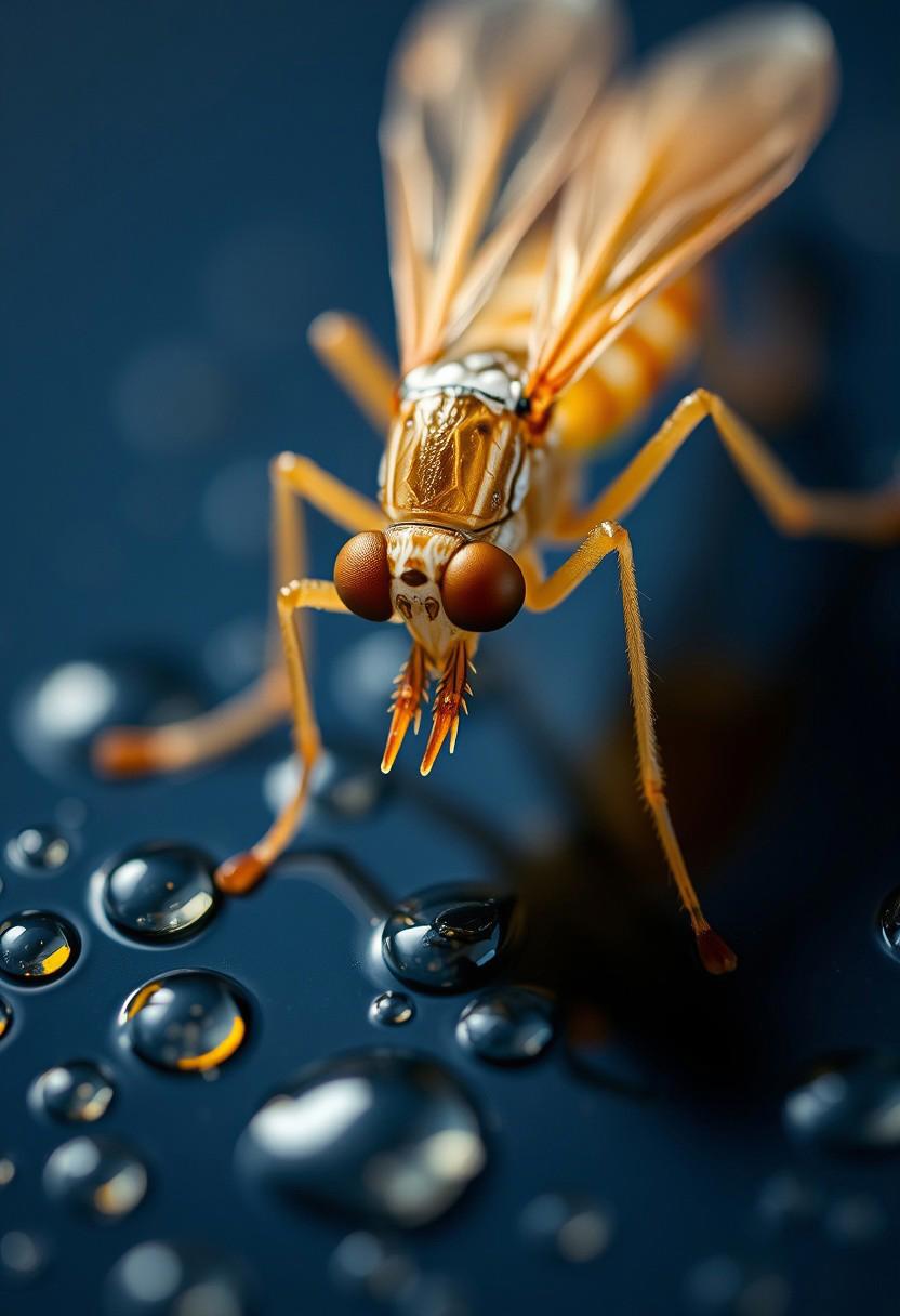 Cute creature from Space like a mosquito, Macro photography of capturing the beauty of nature in a delicate and poetic way. Alien Flora, water hydroforming, Miki Asai Macro photography, close-up, hyper detailed, trending on artstation, fantastic Realism and Sharp Focus, studio photo, intricate details, highly detailed, Water Droplets on Dark Blue and gold Surface Art, water, water reflection,