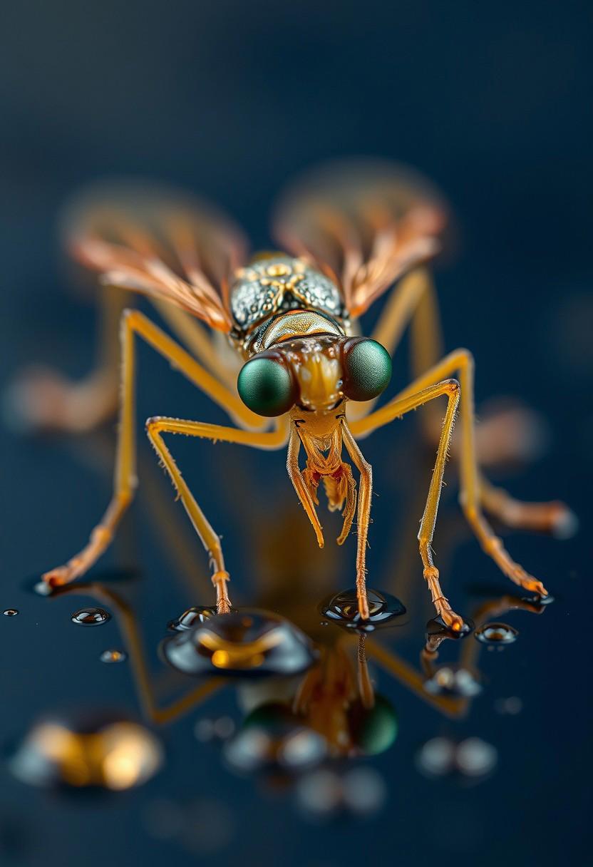 Cute creature from Space like a mosquito, Macro photography of capturing the beauty of nature in a delicate and poetic way. Alien Flora, water hydroforming, Miki Asai Macro photography, close-up, hyper detailed, trending on artstation, fantastic Realism and Sharp Focus, studio photo, intricate details, highly detailed, Water Droplets on Dark Blue and gold Surface Art, water, water reflection,