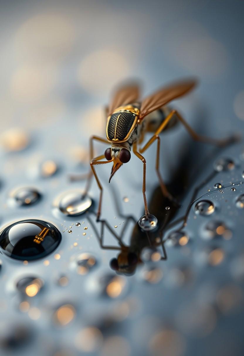 Macro photography of capturing the beauty of nature in a delicate and poetic way, mosquito hydroforming, Miki Asai Macro photography, close-up, hyper detailed, trending on artstation, fantastic Realism and Sharp Focus, studio photo, intricate details, highly detailed, Water Droplets on Dark Blue and gold Surface Art, water, water reflection, Cute water creature, Each image is a glimpse into a serene and enchanting world