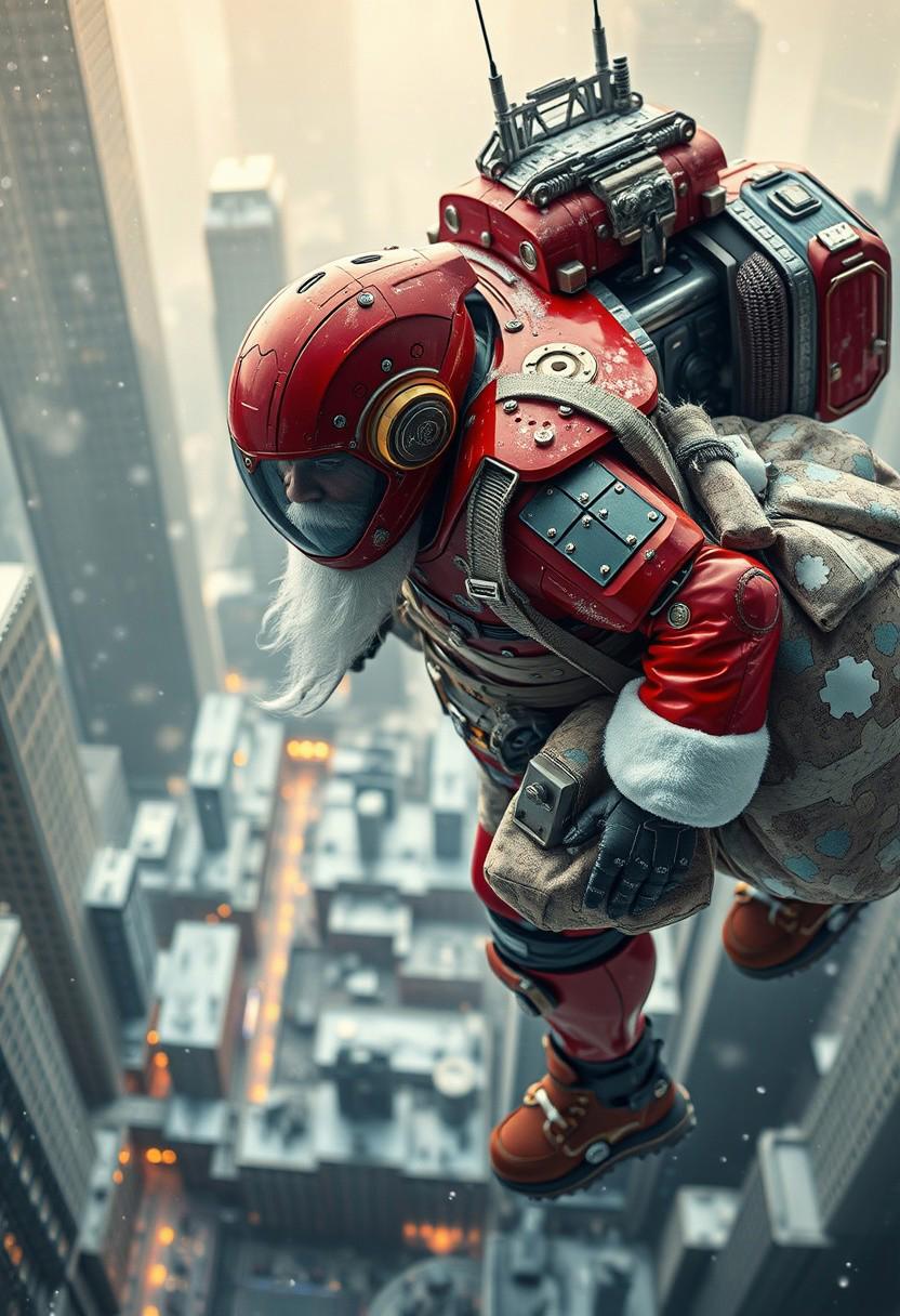 A dramatic high-angle shot focuses on the intricate details of a sleek, cheerful red steampunk jet-powered exosuit, gliding silently through a snow-kissed, steampunk metropolis. The exosuit, adorned with brass and steel accents, is bathed in a soft, ethereal glow. A portly, white-bearded figure, a futuristic Santa Claus, is partially obscured by the exosuit, carrying a high-tech bag of toys filled with countless wrapped gifts. The city, a labyrinth of towering skyscrapers and neon-lit alleyways, stretches out below, a stark contrast to the traditional Christmas scene. The hyper-realistic image should capture the steampunk aesthetic, with a focus on the intricate details of the exosuit and the futuristic cityscape. The image should have a shallow depth of field, emphasizing the exosuit and blurring the background, creating a sense of mystery and wonder.