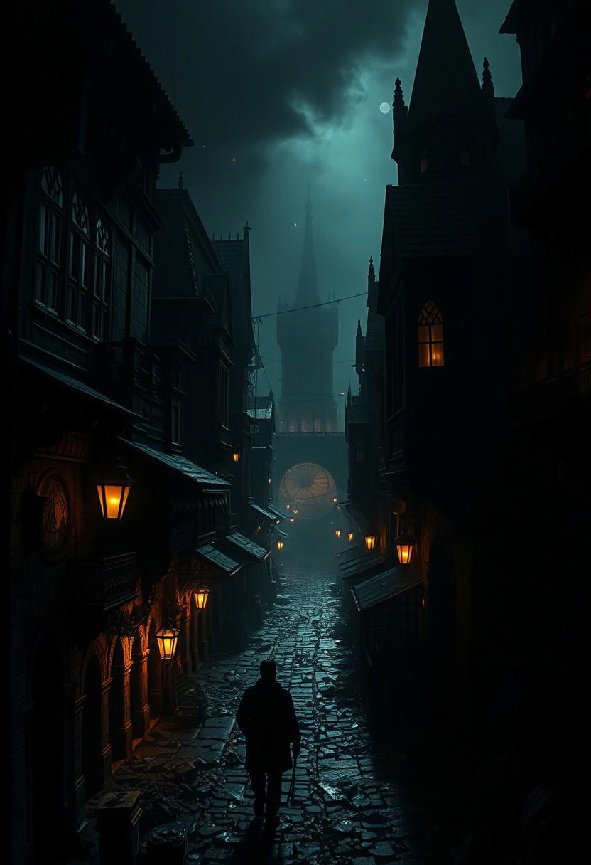 noir,, masterwork breathtaking dslr photo, contrasted shadowed lighting, dark fantasy setting, Pseudo-medieval city in a steampunk like future, Extremely high-resolution details, photographic, realism pushed to extreme, fine texture, incredibly lifelike, smooth textures, $signature, watermark, tattoo$
