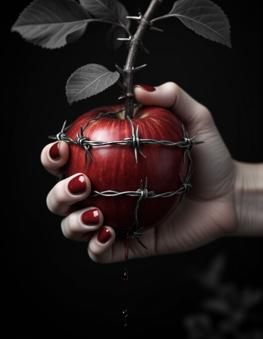 An apple wrapped on all sides with barbed wire. The apple is hanging from a tree. A graceful female hand without any jewelry and with red nail polish on each nail of all five fingers clutches the apple, the barbed wire wounds her palm, blood drips down. Monochrome photograph. Selective color: red. Macrophotograph by Miki Asai.