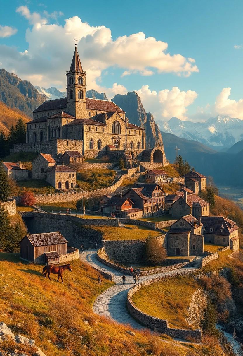 ultra realism, photorealistic image with high quality 8k and above, stable focus on an extremely breathtaking natural landscape of an ancient Christian fortress built on a hill and at the foot of it, there is a village with stone houses, mountains, lakes, boats, waterfalls, castle, ruins, fortress, Catholic ancient Cathedral, castle, village, colorful meadows, rocks, wild forest animals, horses, pasture, river, color balance, golden hour, protective wall around the village, road, medieval period