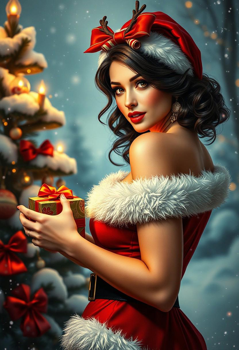 Masterpiece. A Christmas card, vintage (pin-up) beautiful woman, winter, poster, inspiring, santa, present, alluring, seductive, (provocative), pose, (sultry), sexy, high-res, semi realistic, best quality, intricate details, ultra details, good lighting, vibrant colors, very detailed, octane render, ray tracing