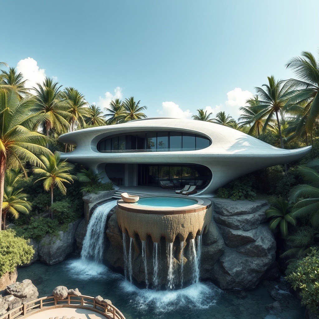 A futuristic concrete modern house in a shape of a space ship with swimigpool on a waterfall inspired from a famous architect, with exotic luxuriant vegetation around, in a tropical jungle setting, near a beach, photorealistic, a masterpiece, 4K, high details, view from close, wide lenses camera