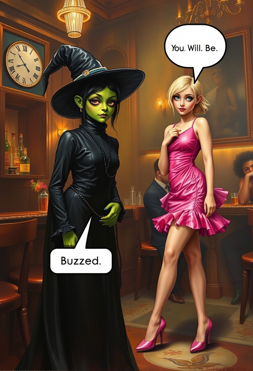 A brightly lit speakeasy in the 1920s style of The Great Gatsby. Elfaba is a scy girl with green skin wearing an all black high-necked Victorian witch outfit that covers her skin from her neck all the way to her ankles and wrists. She has a bored expression on her face and is rolling her eyes. ( A speech box along the bottom ) points to Elfaba and reads " Buzzed? " . A fair skinned short skinny blond girl is dressed in a sexy pink taffeta minidress and pink high heels. She is looking at Elfaba with a wide-eyed excited confident expression. (A speech box at the top of the image points to the blond and contains the text " You. Will. Be. " ). A realistic oil painting.