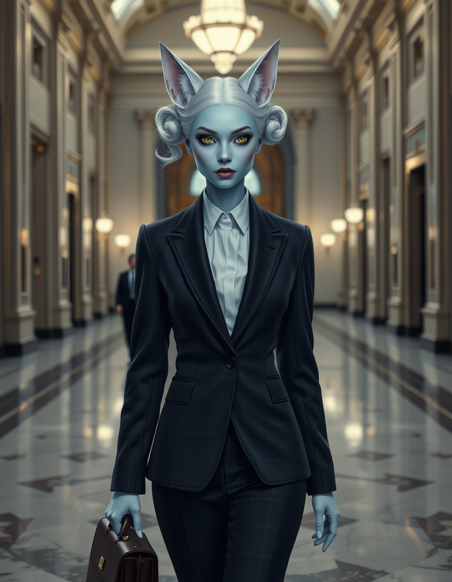 cinematic style, beauty, realism, photorealism, chiaroscuro, high quality, 1girl, pale dusky blue skin, facial markings like whiskers, white cat ears and a white cat tail, pronounced fangs, white hair in two large ringlets, a female miqote with a petite build, bright yellow eyes, cinematic photo a sophisticated lawyer in a sharp, tailored suit, walking confidently through the grand halls of a courthouse, briefcase in hand and heels clicking against the marble floor. 35mm photograph, film, bokeh, professional, 4k, highly detailed