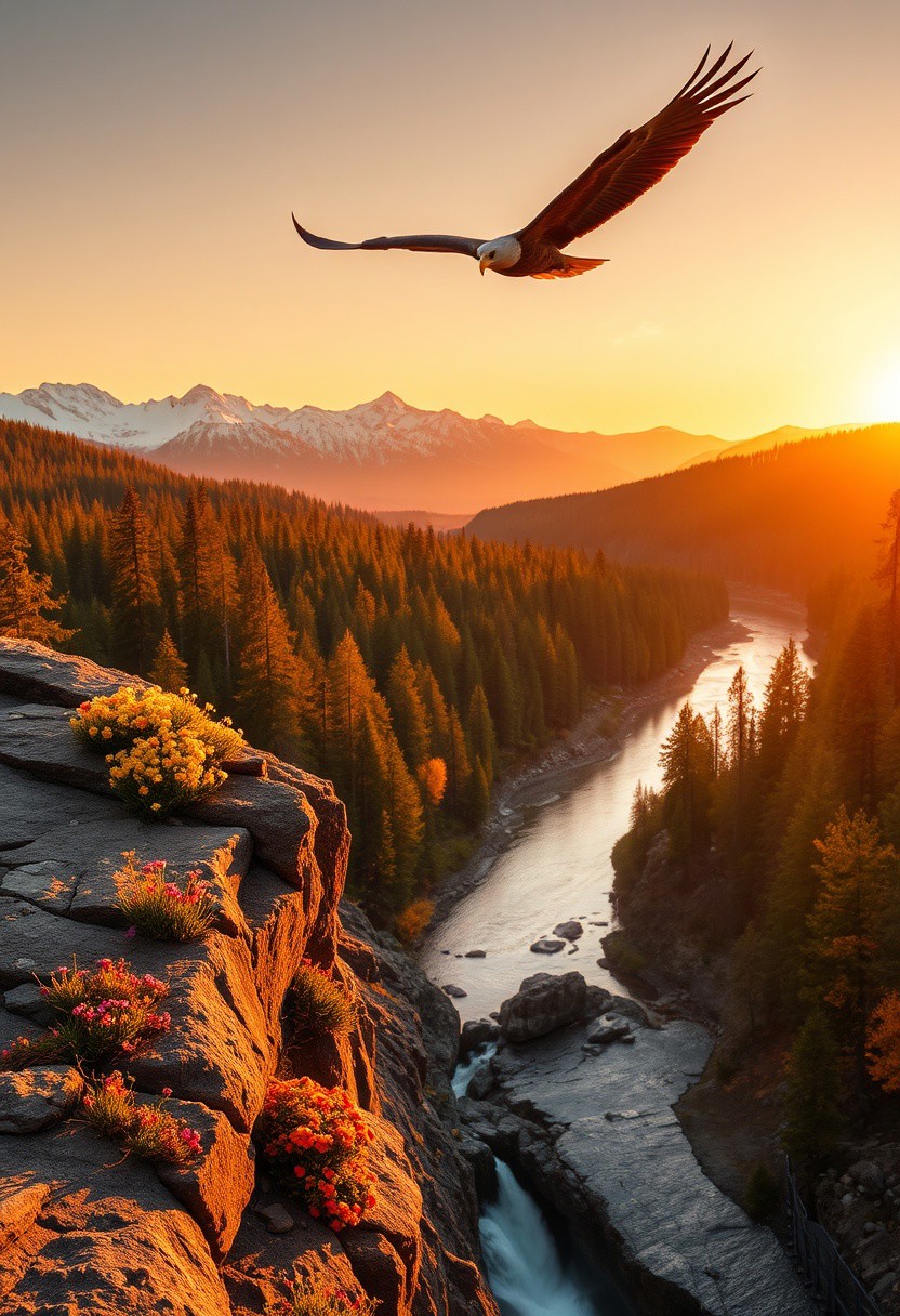 In the warm light of sunset, a majestic eagle soars overhead as the American wilderness unfolds before us. A rugged rocky outcrop, adorned with vibrant wildflowers, overlooks the serene river winding through the valley below. The forest's towering trees, their leaves tinged with autumn's warm hues, stretch towards the sky. A cascading waterfall feeds into the river, its gentle melody a symphony of nature. In the background, snow-capped peaks rise majestically, bathed in the golden light of sunset, their mirrored reflections rippling across the tranquil waters. The rocky outcrop's rough texture is juxtaposed with the delicate petals of the wildflowers, while the forest's intricate foliage and the eagle's soft plumage contrast with the river's smooth surface. The warm lighting casts a soft glow on the landscape, inviting contemplation and awe. Every element contributes to a harmonious composition that celebrates the grandeur and tranquility of this vast, untamed wilderness.