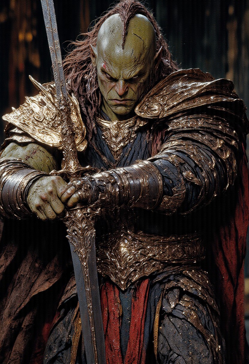 mythp0rt, UHD 32k epic fantasy movie still, closeup portrait, photograph, Beautiful green-skinned muscular female orc wearing armor and holding a sword by the hilt, epic fantasy battle background, cinematic realism, high action pose, perfect pupils, insanely detailed faces, correct digits, realistic skin, intricately detailed, dimly lit, perfect eyes, perfect pupils, expressive eyes, texture, ck-0rcs