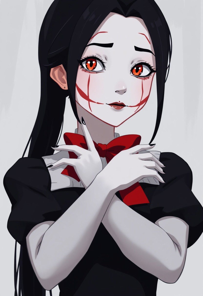 An animated portrait of a black and white striped woman with a red bow tie around her neck. The woman's face is painted with white and red paint. Her eyes are orange and her hair is black. Her hands are white and her arms are crossed over her chest. She is wearing a black dress with white sleeves. The background is gray and white.