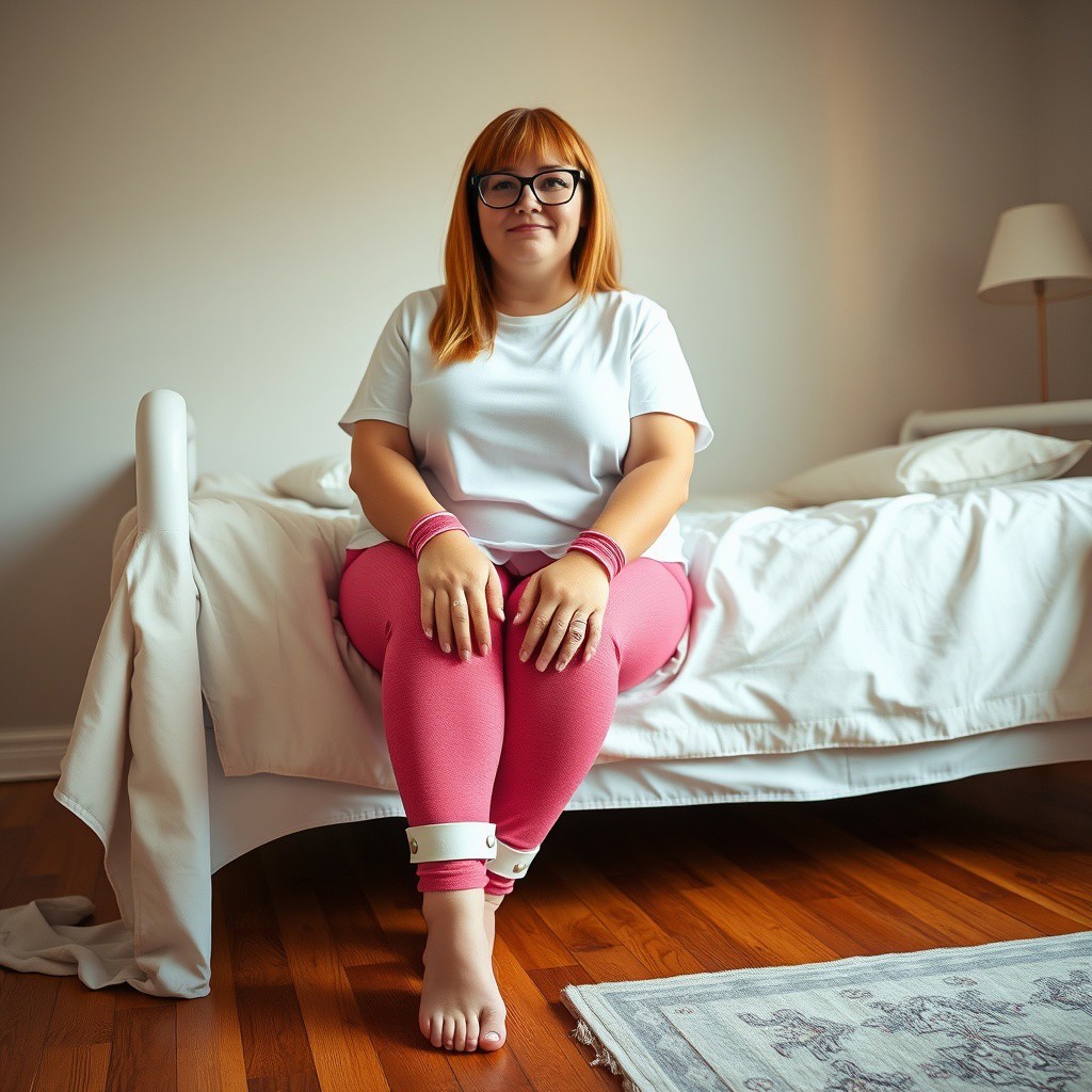 A full body shot of a chubby adult Scottish woman with long straight bangs, glasses, a white t-shirt, and pink textured leggings. She is barefoot wearing white and pink bdsm leather cuffs on ankles sitting the side of a daybed in a bedroom with hardwood floors. Warm lighting,