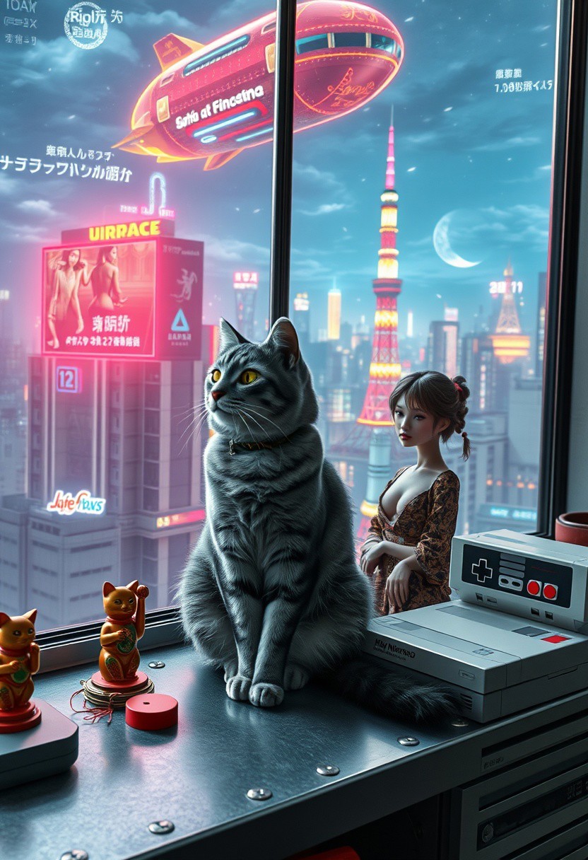 Grey tabby cat with green blue eyes sits on a cluttered metal riveted desk next to a maneki neko statue and a small Nintendo NES, the cat is looking out to a floor to ceiling window that looks out over a futuristic cyberpunk Tokyo skyline with skyscrapers, holographic advertisements, futuristic airships covered with lights and advertisements in Japanese, a space elevator, (((a tall thin beautiful young woman, 22 years old, is standing next to the cat looking out at the city through the window))), The woman is dressed in an ornate Japanese style bath robe, exposing some cleavage and her lower legs. The woman's hair is messy from just waking up and tied up with a ribbon. Artistic cyberpunk, dynamic perspective, a translucent neon projection of a strip club bar advertisement displaying a partially dressed woman is visible on a nearby building,