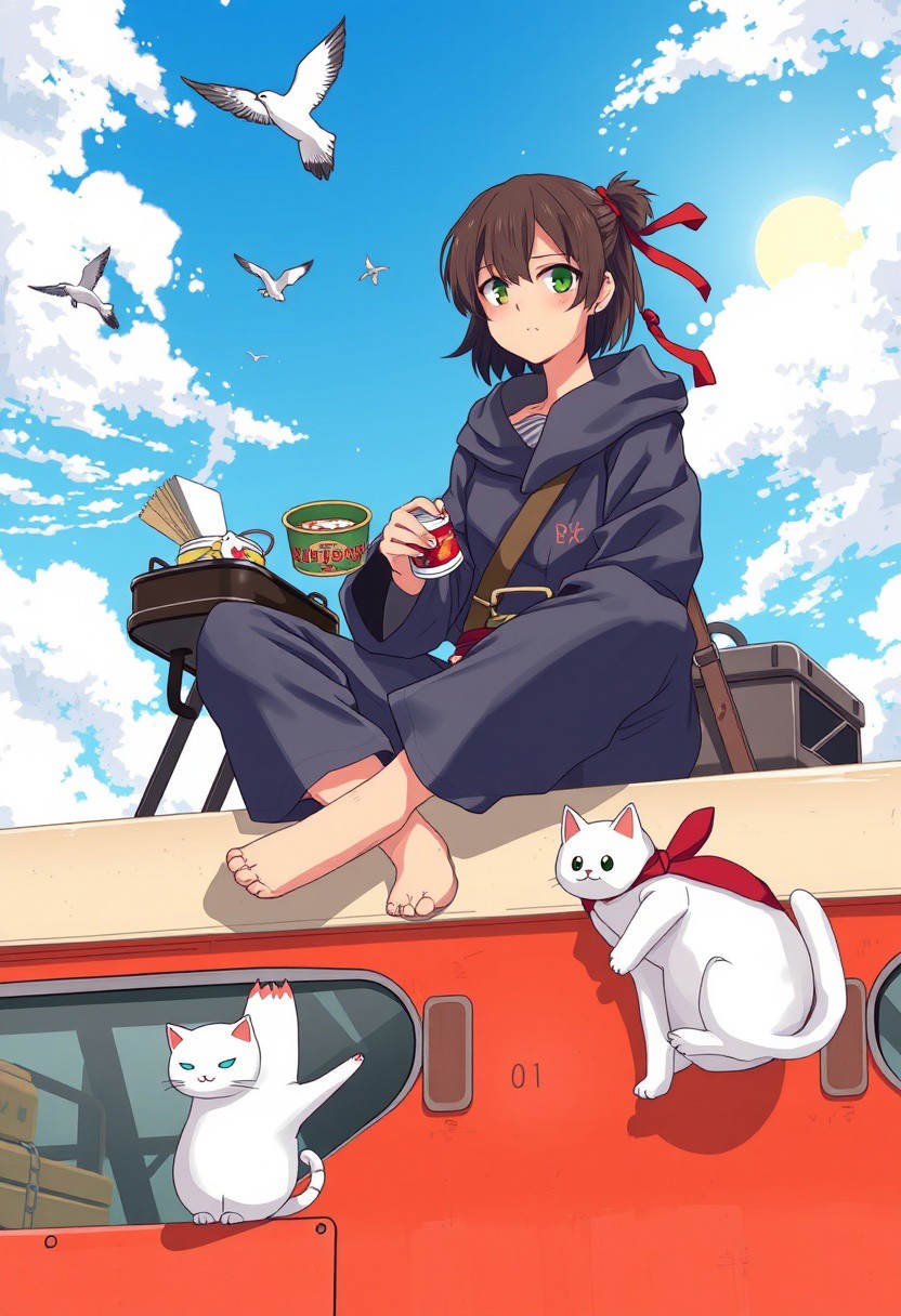 A vibrant, anime-style illustration depicting a 20yo girl sitting crossed legs on the top of a train, bright blue sky. using an old and worn dirty ninja suit, heating instant ramen on a small grill . The atmosphere is lively, yet tranquil at her side a white cat with a red ninja bandana carrying a bag with kunais eating a small fish, traveling searching for adventure. birds flying on the sky, clouds and bright sun,