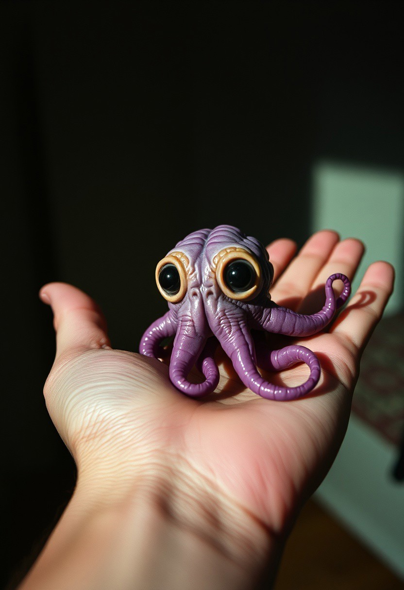 analog film photo image depicts a small,purple, tentacled creature with large eyes and a bulbous body, resting on an open palm. In the foreground, the creature's intricate details are visible: its numerous tentacles, each curled at the end, and its large, round eyes that seem to stare directly into the viewer. The creature's skin appears rough and wrinkled, with deep creases etched across its surface. Its body is a muted purple color, with hints of orange tan around the edges. The background of the image is blurred, but it appears to be a dark room or space, with shadows cast on the walls. The overall atmosphere of the image is one of curiosity and fascination, as if the viewer is being invited to examine this strange creature up close. The composition of the image is simple yet effective, with the creature centered in the frame and the palm serving as a subtle contrast to its alien appearance. The lighting is soft and diffused, which helps to emphasize the texture and detail of the creature's skin. Overall, the image presents a captivating and intriguing scene that invites the viewer to explore the mysteries of this unusual creature . faded film, desaturated, 35mm photo, grainy, vignette, vintage, Kodachrome, Lomography, stained, highly detailed, found footage