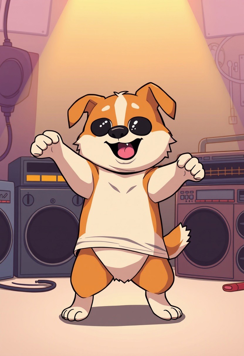 anime style, a dog break dancing with a boom box, chibi, breakdown,