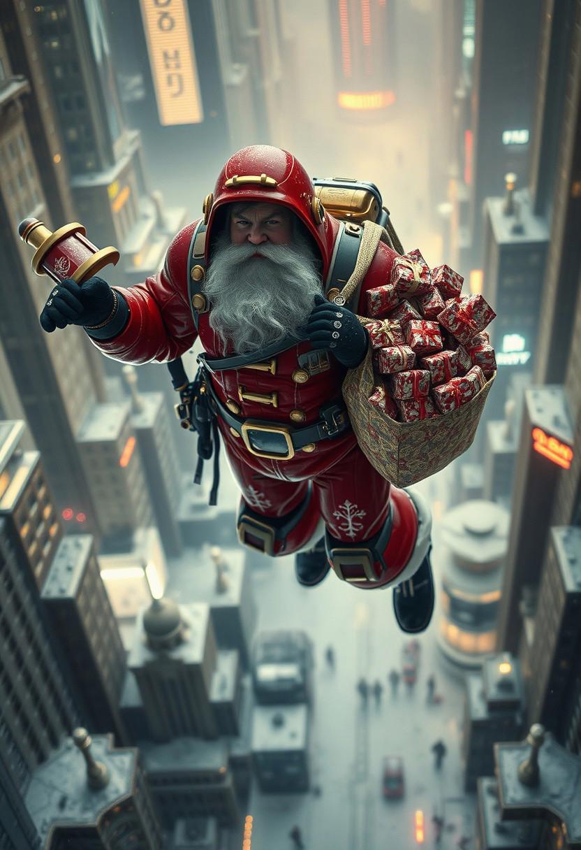 A dramatic high-angle shot focuses on the intricate details of a sleek, cheerful red steampunk jet-powered exosuit, gliding silently through a snow-kissed, steampunk metropolis. The exosuit, adorned with brass and steel accents, is bathed in a soft, ethereal glow. A portly, white-bearded figure, a futuristic Santa Claus, is partially obscured by the exosuit, carrying a high-tech bag of toys filled with countless wrapped gifts. The city, a labyrinth of towering skyscrapers and neon-lit alleyways, stretches out below, a stark contrast to the traditional Christmas scene. The hyper-realistic image should capture the steampunk aesthetic, with a focus on the intricate details of the exosuit and the futuristic cityscape. The image should have a shallow depth of field, emphasizing the exosuit and blurring the background, creating a sense of mystery and wonder.