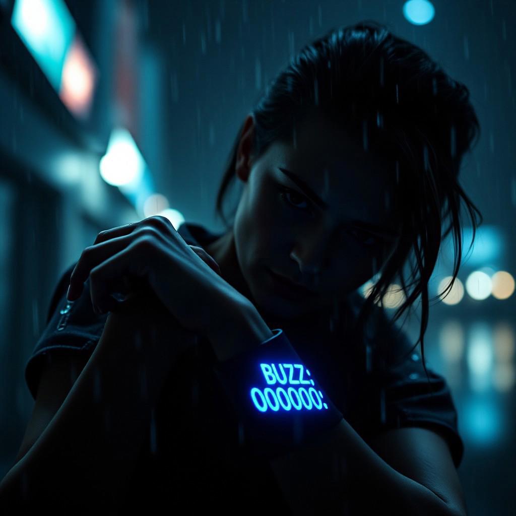Dystopian movie scene still where woman is looking at her arm, there is a blue glowing text on it "BUZZ: 000000", cyberpunk, raining, cinematic, futuristic, somber