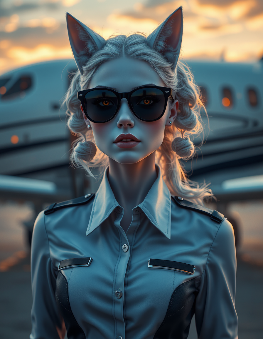cinematic style, beauty, realism, photorealism, chiaroscuro, high quality, 1girl, pale dusky blue skin, facial markings like whiskers, white cat ears and a white cat tail, pronounced fangs, white hair in two large ringlets, a female miqote with a petite build, bright yellow eyes, cinematic photo an elegant pilot in a sleek, form-fitted flight uniform, standing in front of a luxurious private jet at sunset, her sunglasses reflecting the dramatic sky. 35mm photograph, film, bokeh, professional, 4k, highly detailed