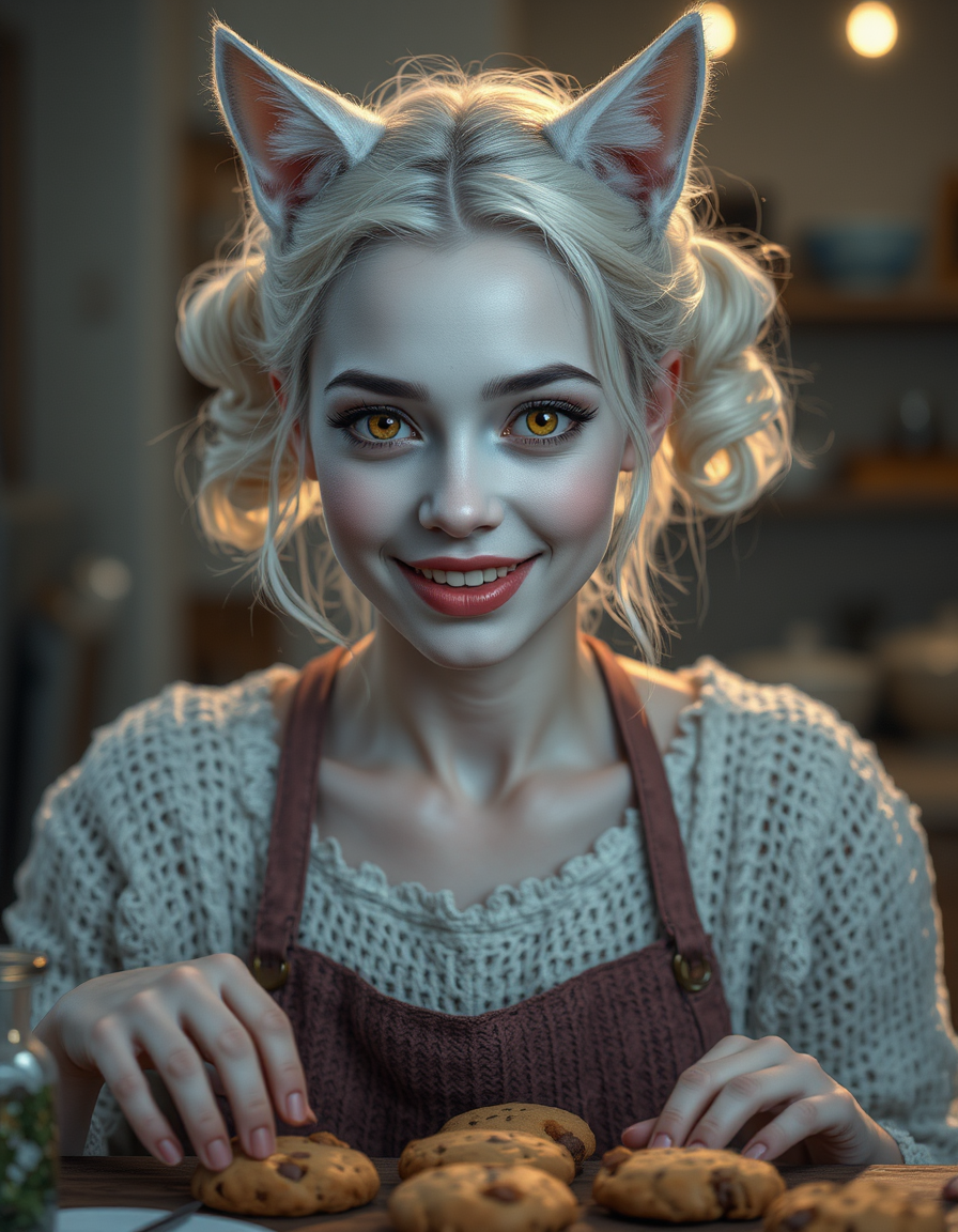 cinematic style, beauty, realism, photorealism, chiaroscuro, high quality, 1girl, pale dusky blue skin, facial markings like whiskers, white cat ears and a white cat tail, pronounced fangs, white hair in two large ringlets, a female miqote with a petite build, bright yellow eyes, cinematic photo a kind, introverted woman at home baking cookies, her serene and natural expression reflecting her joy in simple, wholesome activities. 35mm photograph, film, bokeh, professional, 4k, highly detailed . 35mm photograph, film, bokeh, professional, 4k, highly detailed