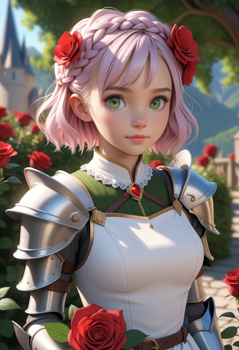 photorealistic, octane render, best quality, 1girl, petite, short girl, noelle gi, short hair, white hair, green eyes, braid, hair flower, red rose, knight armor, fantasy armor, maid skirt, belt, looking at viewer, sharp focus, (8k), (4k), (Masterpiece), (Best Quality), (realistic skin texture), extremely detailed, intricate, hyper detailed, illustration, soft lighting, high resolution, sharp detail, vivid, colorful, outdoors, nature, <lora:noelle by Goofy Ai:1>, <lora:add_detail:0.6>,
