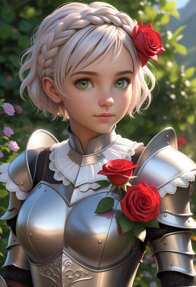 photorealistic, octane render, best quality, 1girl, petite, short girl, noelle gi, short hair, white hair, green eyes, braid, hair flower, red rose, knight armor, fantasy armor, maid skirt, belt, looking at viewer, sharp focus, (8k), (4k), (Masterpiece), (Best Quality), (realistic skin texture), extremely detailed, intricate, hyper detailed, illustration, soft lighting, high resolution, sharp detail, vivid, colorful, outdoors, nature, <lora:noelle by Goofy Ai:1>, <lora:add_detail:0.6>,