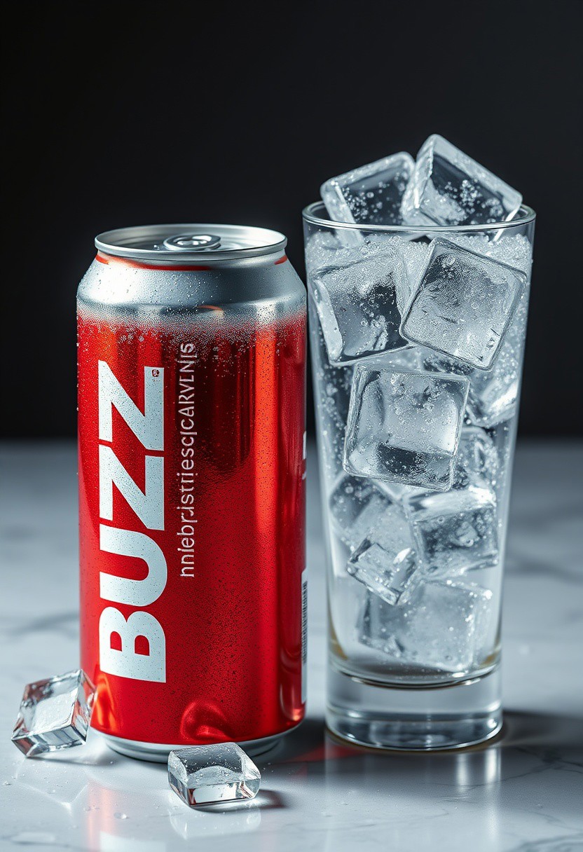 Hyper Realistic can of soda with the letters "BUZZ" down the side of the can, next to a unique glass with ice cubes in it, can has condensation dripping down it