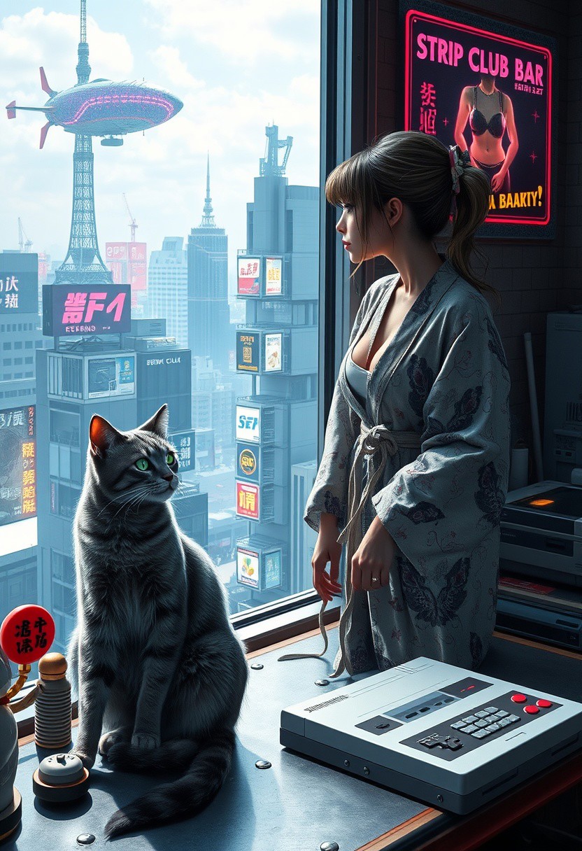 Grey tabby cat with green blue eyes sits on a cluttered metal riveted desk next to a maneki neko statue and a small Nintendo NES, the cat is looking out to a floor to ceiling window that looks out over a futuristic cyberpunk Tokyo skyline with skyscrapers, holographic advertisements, futuristic airships covered with lights and advertisements in Japanese, a space elevator, (((a tall thin beautiful young woman, 22 years old, is standing next to the cat looking out at the city through the window))), The woman is dressed in an ornate Japanese style bath robe, exposing some cleavage and her lower legs. The woman's hair is messy from just waking up and tied up with a ribbon. Artistic cyberpunk, dynamic perspective, a translucent neon projection of a strip club bar advertisement displaying a partially dressed woman is visible on a nearby building,