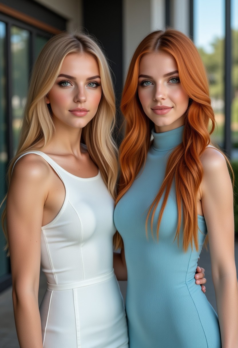 2girl, left image tall woman, Avr1L, 25 year-old, long straight blond hair, high-fashion white sleeveless dress, freckles, full lips, full makeup, almond-shaped deep-blue eyes, striking eyes right image tall woman, 28 year-old, long straight red hair, high-fashion baby-blue sleeveless high neck dress, full lips, full makeup, cleft-chin, almond-shaped deep-blue eyes, striking eyes, wide angle full-body macro shot from street