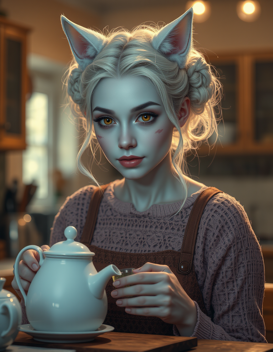 cinematic style, beauty, realism, photorealism, chiaroscuro, high quality, 1girl, pale dusky blue skin, facial markings like whiskers, white cat ears and a white cat tail, pronounced fangs, white hair in two large ringlets, a female miqote with a petite build, bright yellow eyes, cinematic photo a smart woman preparing tea in a peaceful kitchen, the warm, gentle light highlighting her serene and natural face as she goes through the familiar routine. 35mm photograph, film, bokeh, professional, 4k, highly detailed