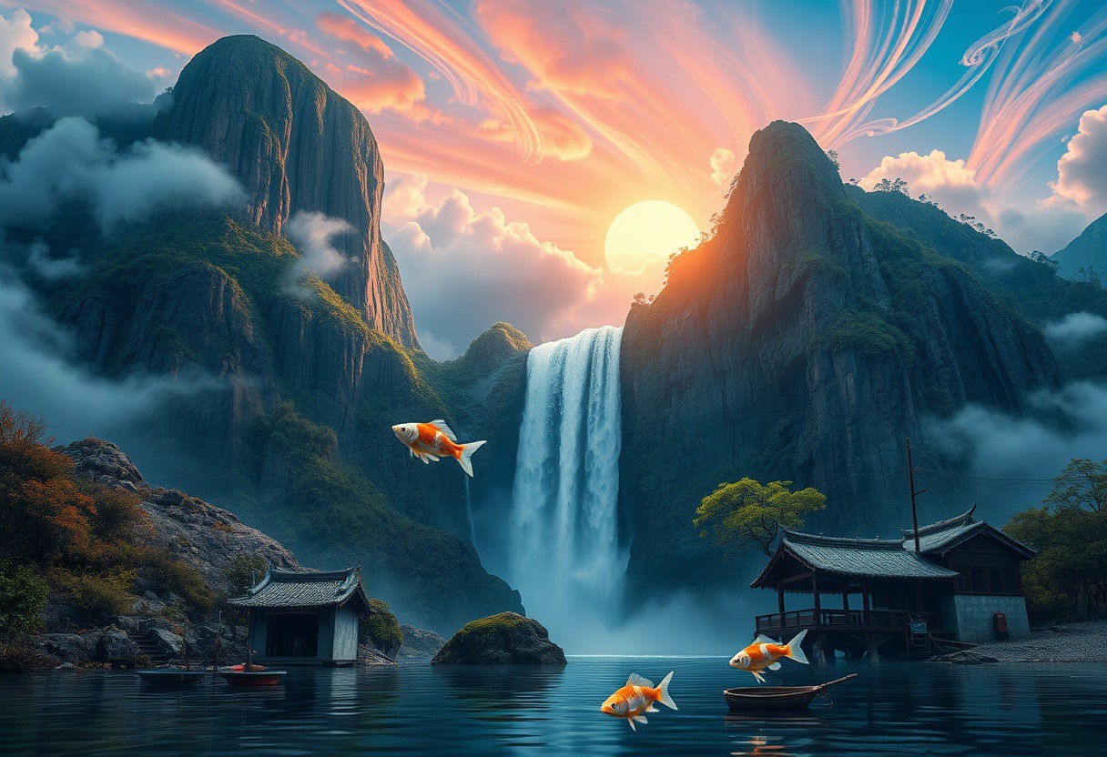 there is a tall waterfall, majestic water fall, the water fall is coming out of a mountain, Chinese mountains, there is moss growing on the mountains, small bonsai trees on the mountain, water mist, sun in the sky, sun behind clouds, water basin at base of cliff, small hut at base of cliff, small hut next to water fall, fishing rack, fishing polls, basket, fishing spot on shore, coy fish, white orange and gold coy fish, coy fish jumping out of water, shore, clouds, swirling, vivid colours, blue, orange, pink, sky, ancient, overgrown, landscapes, intricate details, background colourful, cloud streams, dynamic, vibrant colours, high quality, detailed, realistic, beautiful, extreme detail, hyper realistic, dynamic light, expressive, digital media (artwork), hi res, masterpiece, RAW, photo, 8k, very sharp, very detailed, realistic, real, cinematic view, shaded, detailed shading, shading,