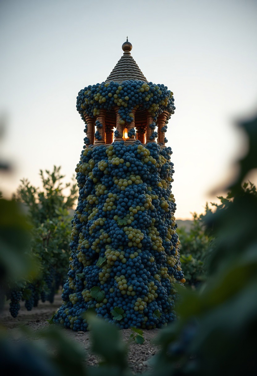 An ancient tower made of grapes, depth of field, clean background, high quality, best arkwork, highres, nice composition, ambient lighting
