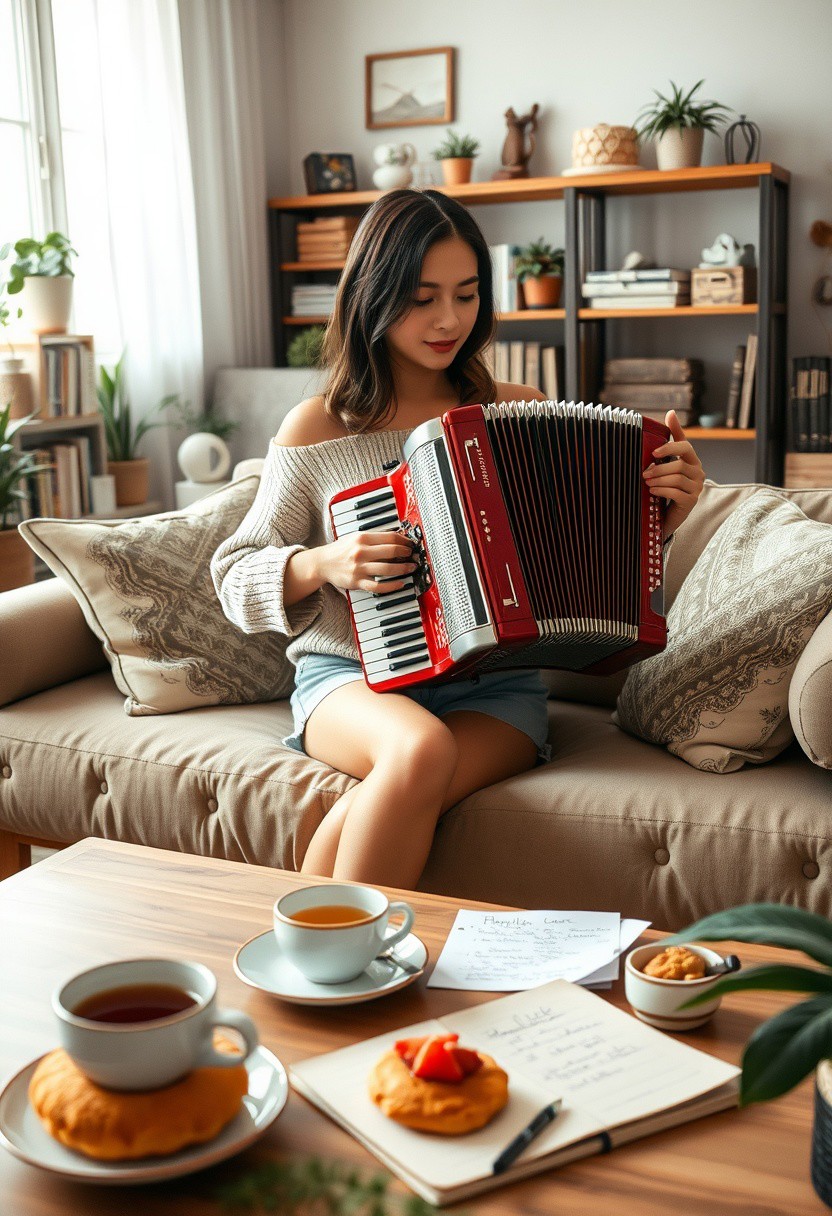 A photo depicting a young woman sitting on a comfortable sofa in a warmly lit living room. she plays a vintage red accordion. Her outfit is casual, consisting of a loose sweater with a wide neckline, revealing her shoulders, and light denim shorts. The minimalistic attire highlights her relaxed and artistic demeanor. The background showcases a charming and eclectic living space filled with bookshelves, potted plants, and decorative knick-knacks. The lower portion of the image includes a coffee table adorned with a cup of tea, a plate of strawberry-topped pastries, scattered notes, and a sketchbook, enhancing the lived-in atmosphere. The lighting is diffused, with soft natural light streaming in from an unseen window, creating a cozy ambiance. Special details include the vintage design of the accordion, the intricate patterns on the pillows, and the slight glow of the tea cup and pastries. The muted tones of the background contrast harmoniously with the brighter accents of the foreground elements, such as the red accordion and the vibrant greenery of the plants. The mood is peaceful and nostalgic, evoking a quiet moment of creativity and leisure. The interplay of light and shadow across the room creates a dynamic yet serene composition. The perspective is slightly elevated, offering a clear view of the entire scene while maintaining an intimate connection with the subject.