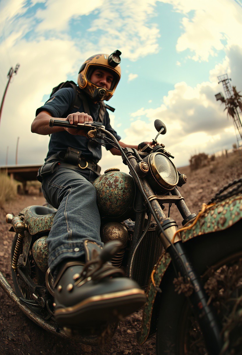 (masterpiece, intricate:1.3), (best quality, hires textures, high detail:1.2), <lora:Obsidian_Jade_Style:1>, golden theme, <lora:Starry_Morph:1> starry_morph ramirez gonzalo and his chopper , rotten , rotten cardboard "I NEED BUZZ!" "funny" fisheye lenses 12mm, very high resolution