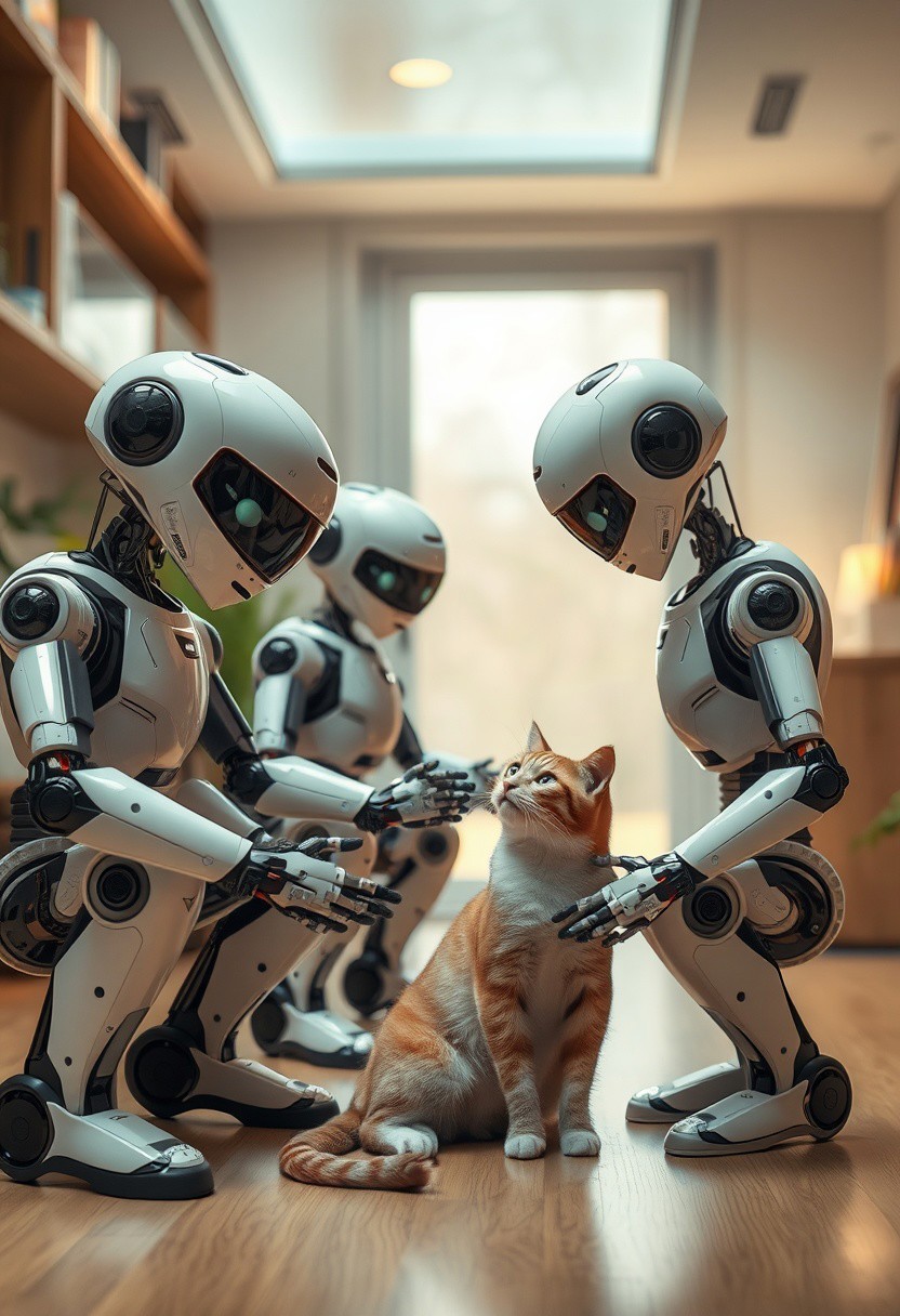FUTURE HOME, MODERN TECHNOLOGY, A FAMILY OF ROBOTS PETING A REAL CAT