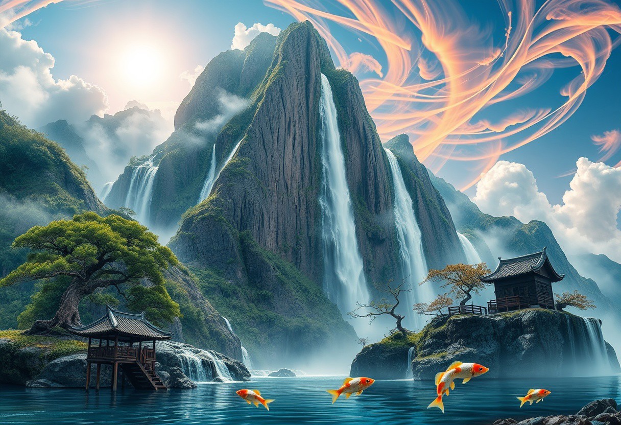 there is a tall waterfall, majestic water fall, the water fall is coming out of a mountain, Chinese mountains, there is moss growing on the mountains, small bonsai trees on the mountain, water mist, sun in the sky, sun behind clouds, water basin at base of cliff, small hut at base of cliff, small hut next to water fall, fishing rack, fishing polls, basket, fishing spot on shore, coy fish, white orange and gold coy fish, coy fish jumping out of water, shore, clouds, swirling, vivid colours, blue, orange, pink, sky, ancient, overgrown, landscapes, intricate details, background colourful, cloud streams, dynamic, vibrant colours, high quality, detailed, realistic, beautiful, extreme detail, hyper realistic, dynamic light, expressive, digital media (artwork), hi res, masterpiece, RAW, photo, 8k, very sharp, very detailed, realistic, real, cinematic view, shaded, detailed shading, shading,
