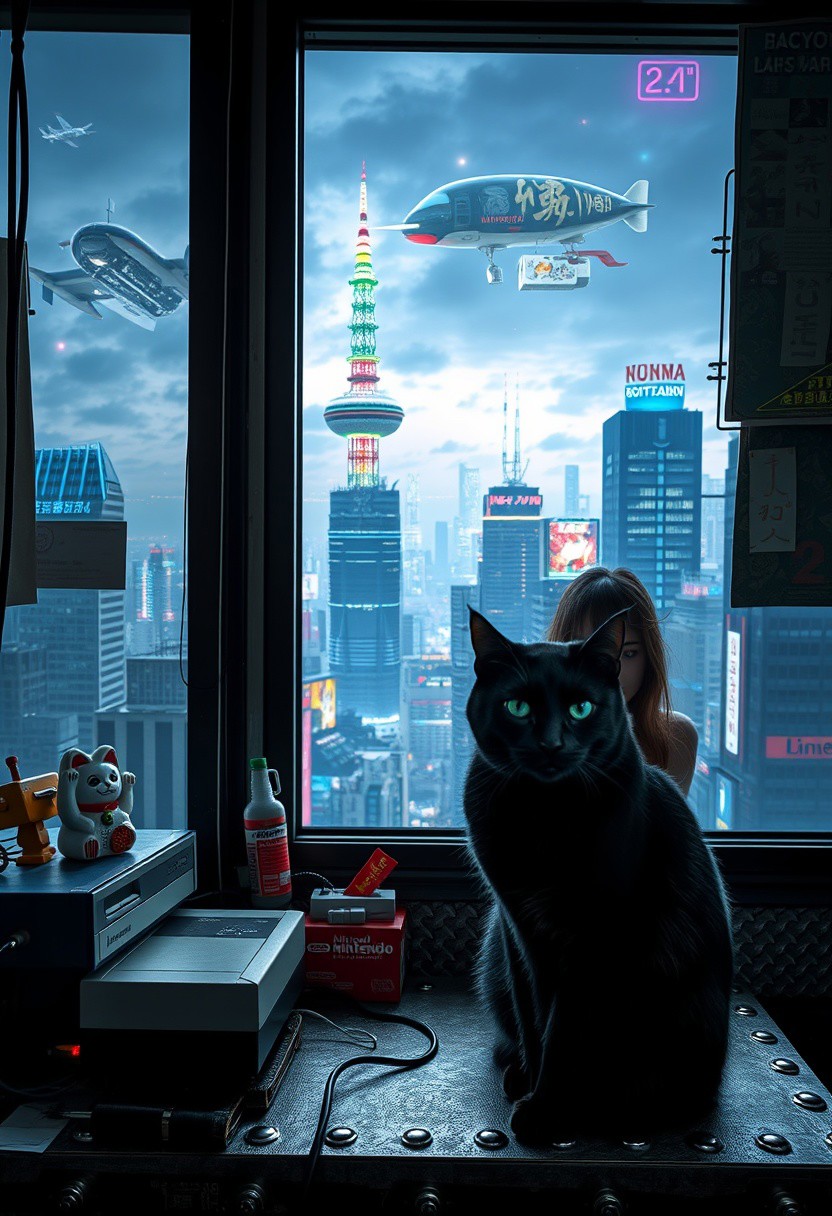 Extreme high resolution and detailed photo of Black Cat with green blue eyes sits on a cluttered metal riveted desk next to a maneki neko statue and a small Nintendo NES, the cat is looking out to a floor to ceiling window that looks out over a futuristic cyberpunk Tokyo skyline with skyscrapers, holographic advertisements, futuristic airships covered with lights and advertisements in Japanese, a space elevator, (((a tall thin beautiful young woman, 22 years old, is standing next to the cat looking out at the city through the window))), The woman is dressed in an ornate Japanese style bath robe and her lower legs. The woman's hair is messy from just waking up and tied up with a ribbon. Artistic cyberpunk, dynamic perspective, a translucent neon projection of a strip club bar advertisement displaying a partially dressed woman is visible on a nearby building,