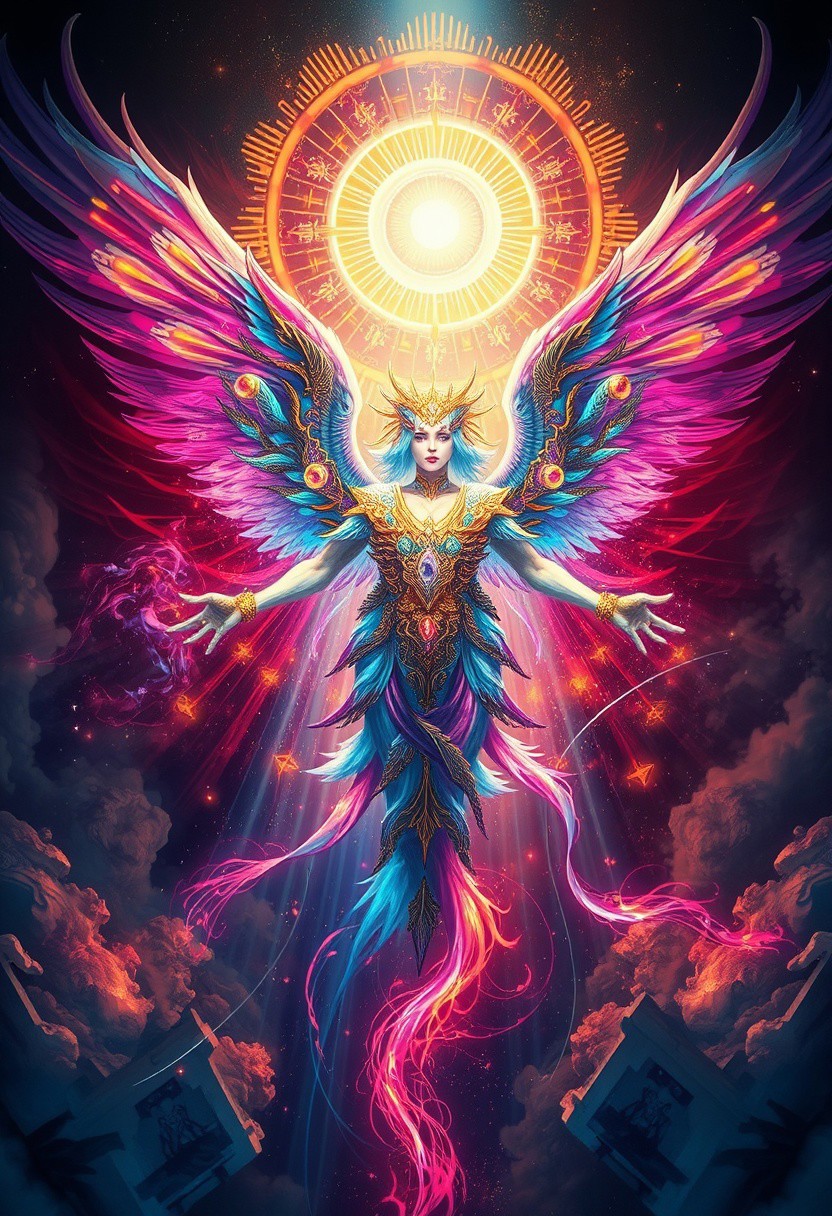 A bird’s eye view fantasy art depicting a celestial being under strong hard light, showcasing vibrant colors, intricate details, symbolic imagery, ethereal atmosphere, glowing effects, and harsh shadows, with a top-down perspective and elegant composition.