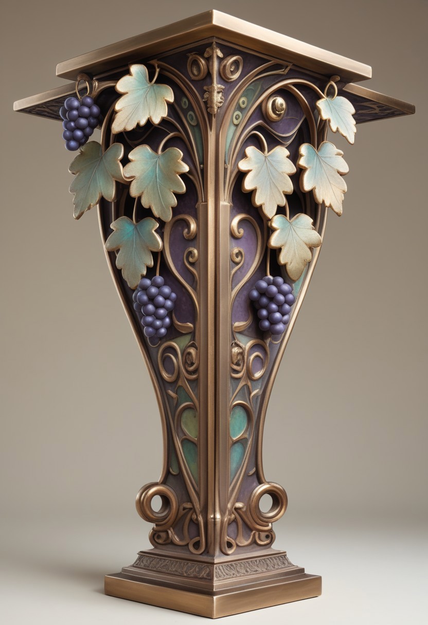 qu4ntum, A cast bronze sculpture depicting stylized grape forms with floral patterns, illuminated from behind, showcasing muted colors and an antique patina finish. The art nouveau aesthetic features flat planes, flowing lines, and organic motifs in a medieval mystical style.