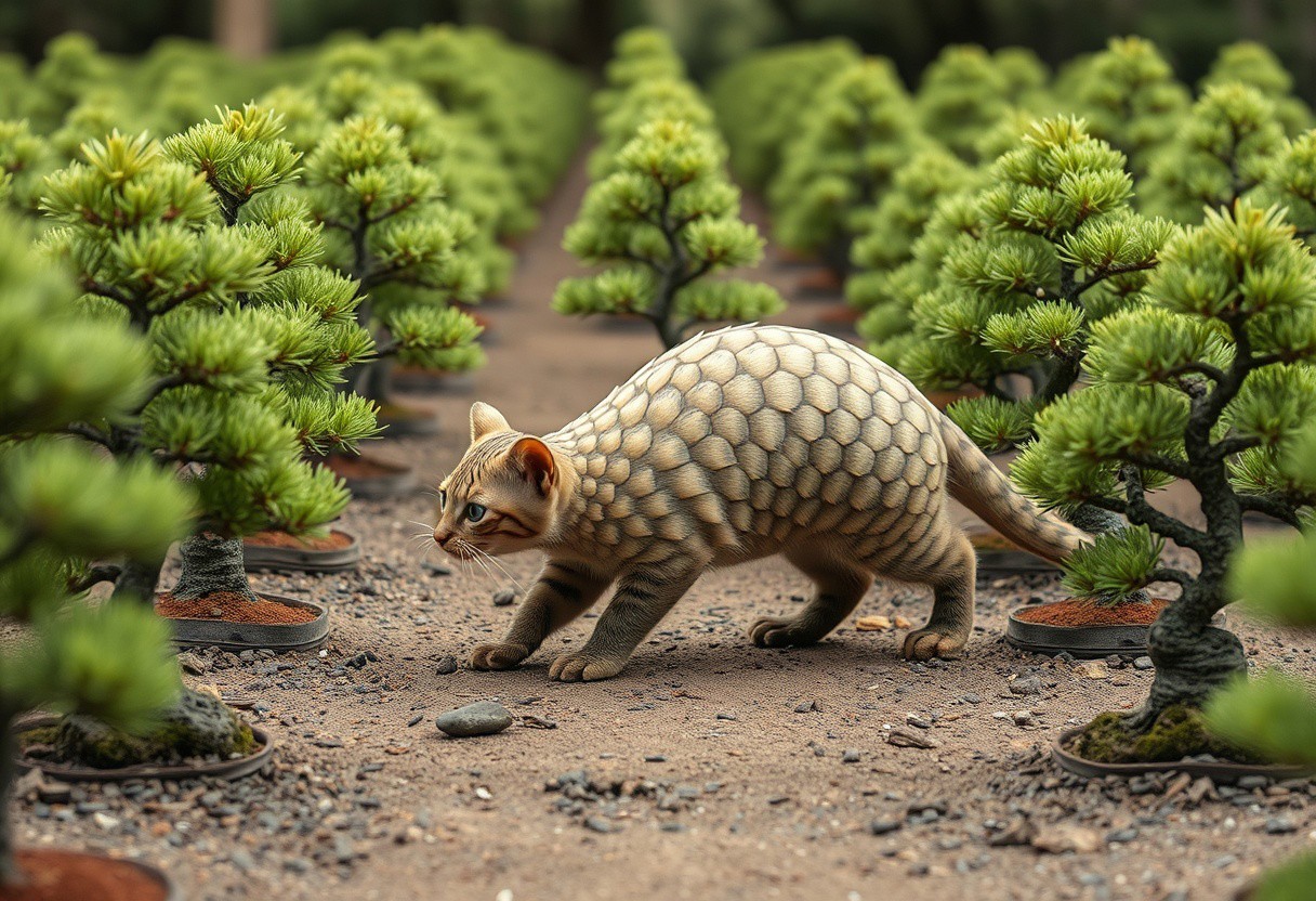 pangolin cat walking through a forest of tiny bonsai trees that are all spaced apart as though they were full sized trees