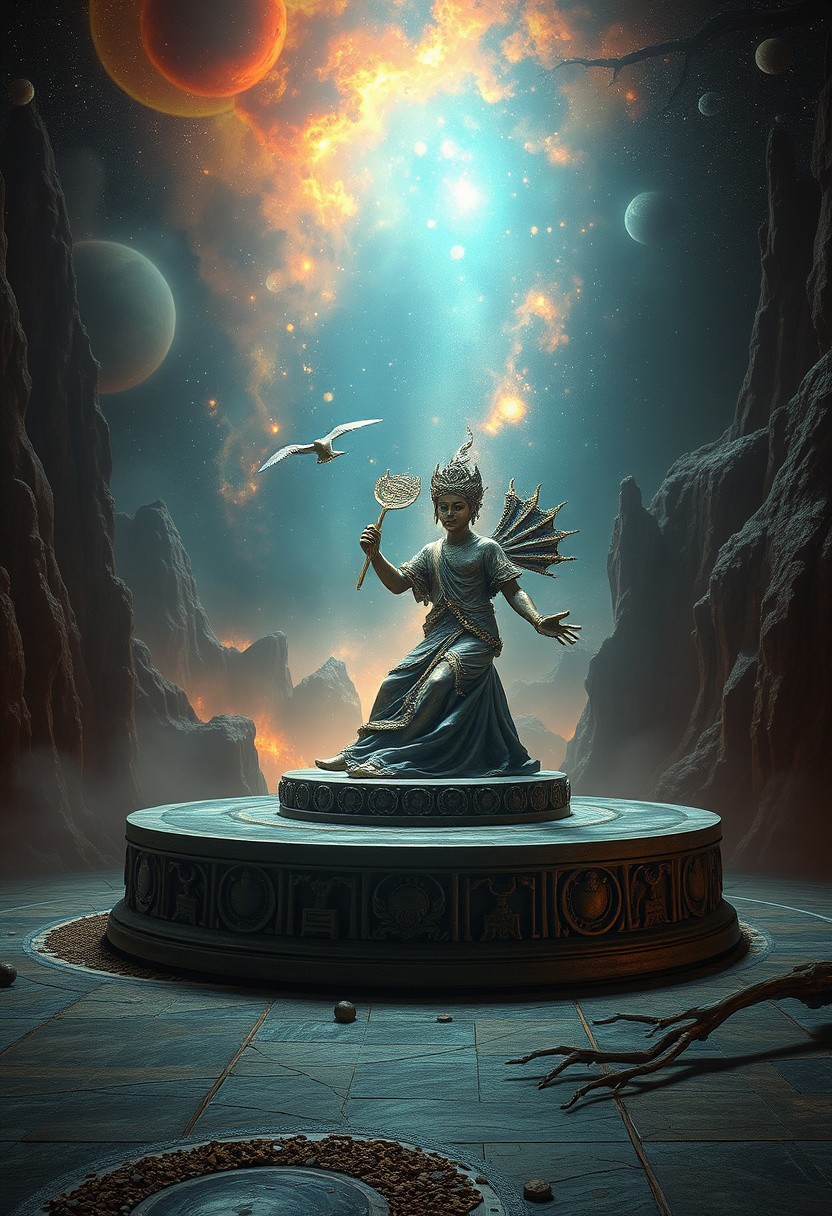 Surreal digital art depicting a cast bronze platform with intense dramatic lighting vibrant colors dreamlike composition intricate details nature-inspired themes cosmic elements abstract landscapes atmospheric lighting futuristic tones imaginative realism conceptual depth ethereal mood antique patina finish high contrast creates tension