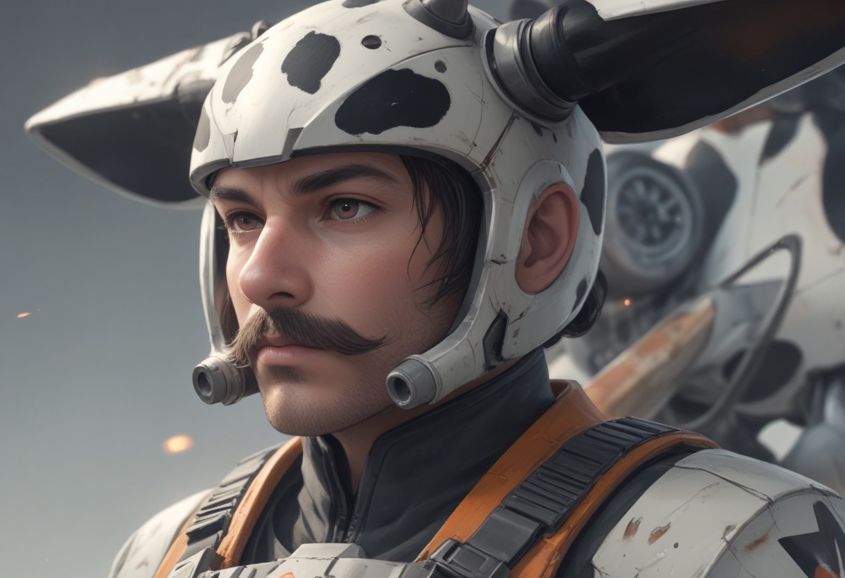 Create a hyper-realistic artwork with a close-up of an action general uniform on a time machine background. Incorporate elements inspired by Mikecow, with an orange and white color scheme reminiscent of post-punk aesthetics. The uniform should be designed in the style of General Uniform, inspired by Glen Angus, and feature a large, distinctive moustache. In the background, include an X-wing and a flying cow, as seen in the works of An Gyeon. Ensure the artwork is a full product shot with a zineisk and hyper-realistic style, utilizing Octane render and depth of field. Apply a 35mm film grain effect and aim for an 8k resolution. Trending on Artstation, this artwork should also be artgem-worthy.