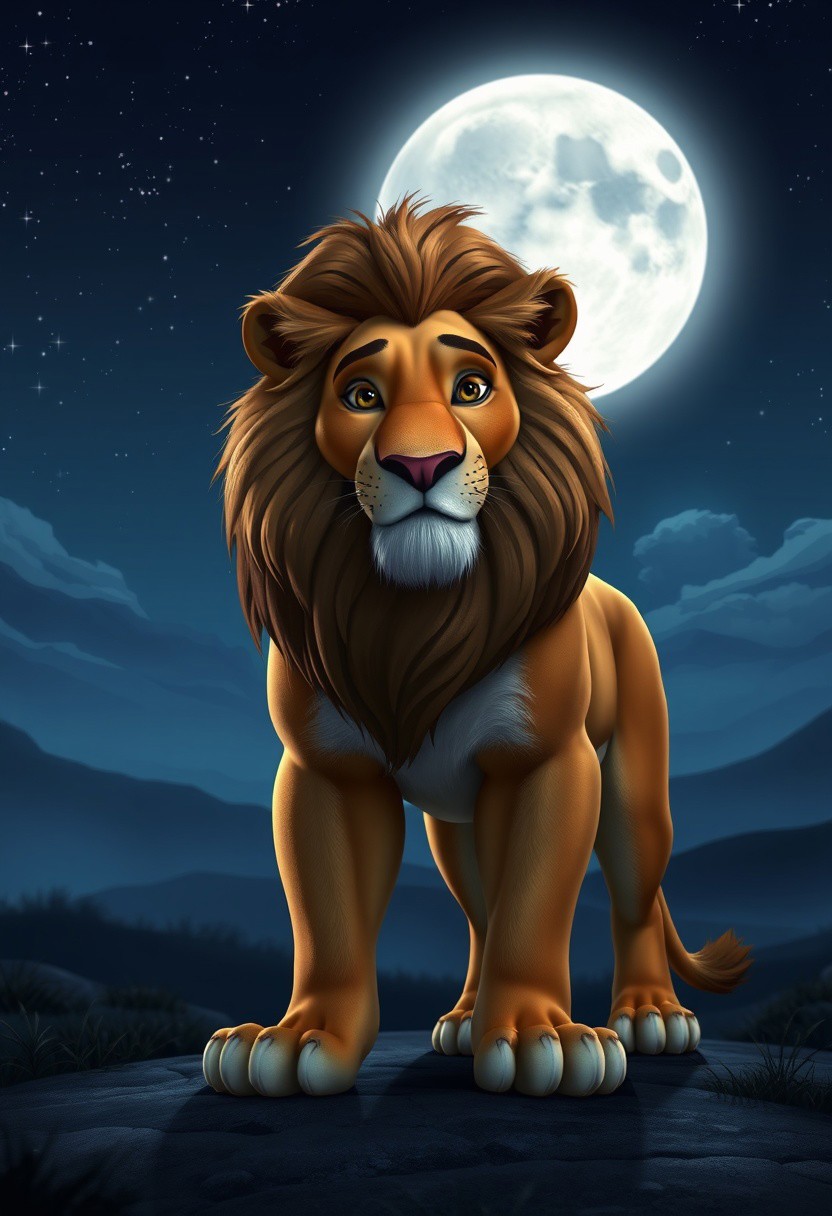 A majestic Pixar-style lion stands proudly in a moonlit night landscape. The camera frames the lion's regal pose against a serene, star-studded sky with a full moon casting a silver glow on the surrounding terrain. Soft, gentle lighting accentuates the lion's fur, while the dark shadows beneath its paws and around its eyes create depth.