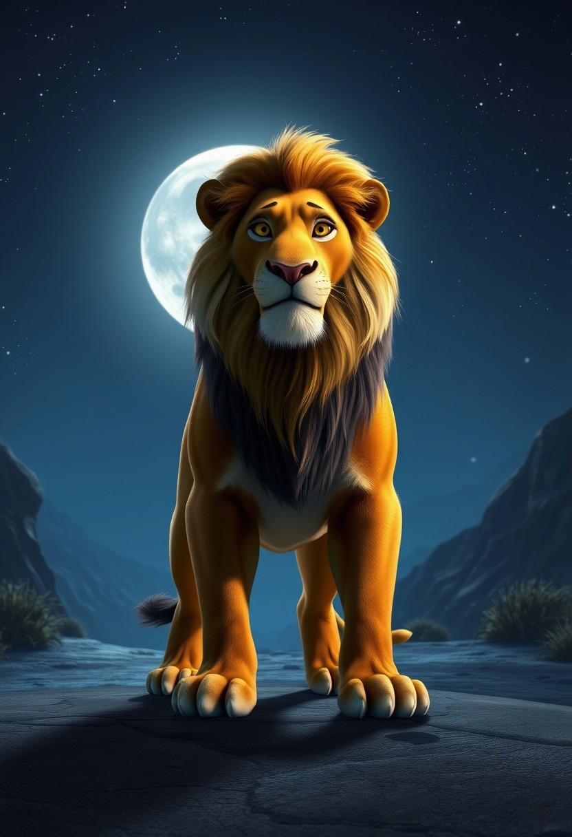 A majestic Pixar-style lion stands proudly in a moonlit night landscape. The camera frames the lion's regal pose against a serene, star-studded sky with a full moon casting a silver glow on the surrounding terrain. Soft, gentle lighting accentuates the lion's fur, while the dark shadows beneath its paws and around its eyes create depth.