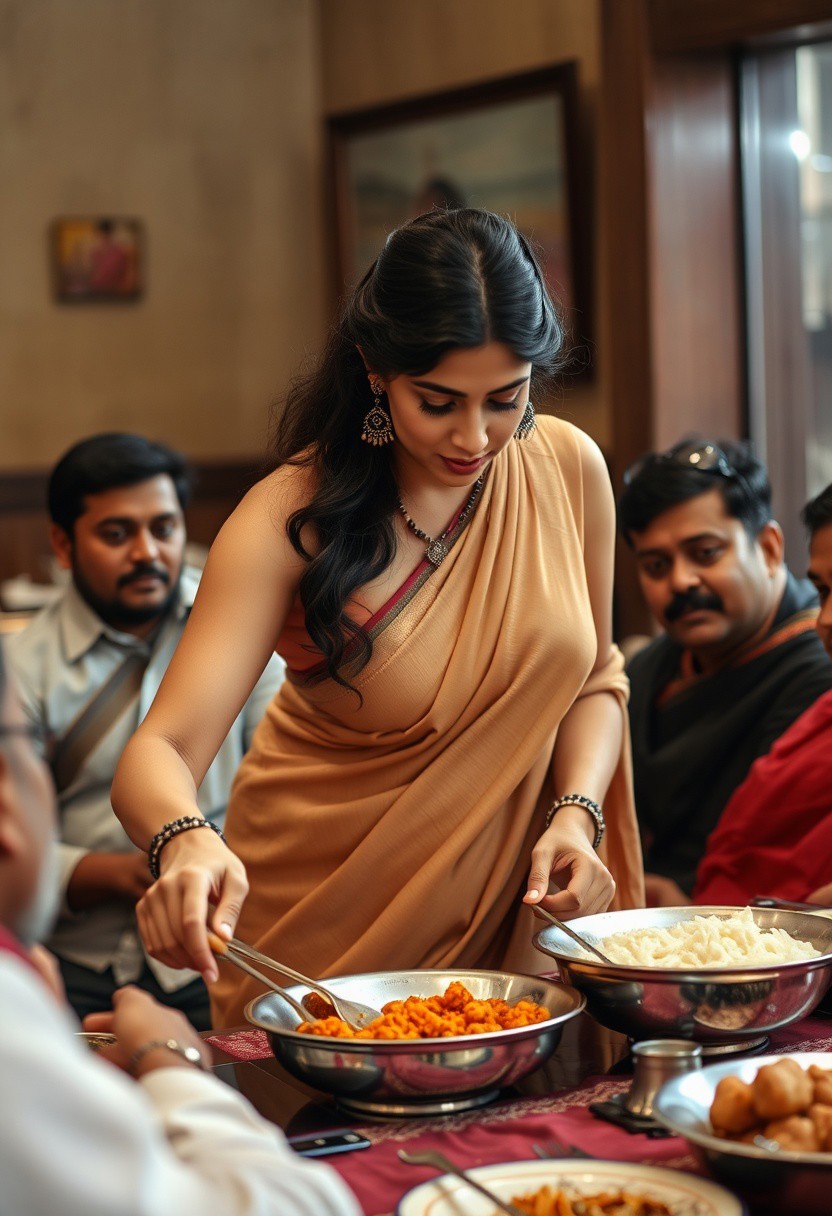 Busy desi woman wearing saree without blouse, serving food to multiple Indian men at dining table, leaning forward, saggy boobs, big boobs, dark nipples, woman looks like Kareena Kapoor