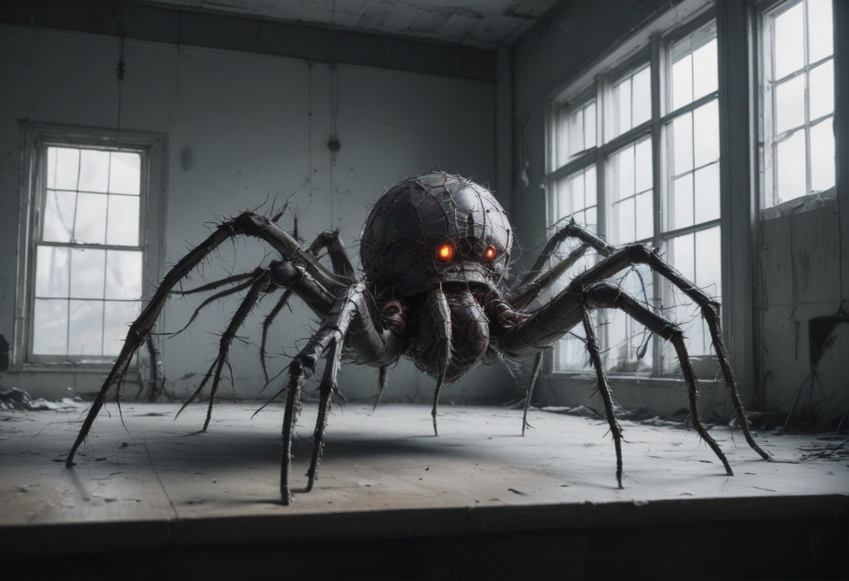 Create an 8K animation model of a woman sitting on top of a giant spider, inspired by the art styles of Yusuke Murata and Takashi Murakami, with detailed body shape and accurate hands. Incorporate intricate, cinematic lighting reminiscent of Gregory Crewdson's work. The model should have a female gigachad body type and be featured in a scene with a centipede and complex, detailed cobwebs. The output should be in the style of a TikTok video, with a focus on showcasing the animation model's details. Ensure the face and body are well-defined, and the overall design is reminiscent of Kai'sa. The final output should be an OOAK (one-of-a-kind) piece.