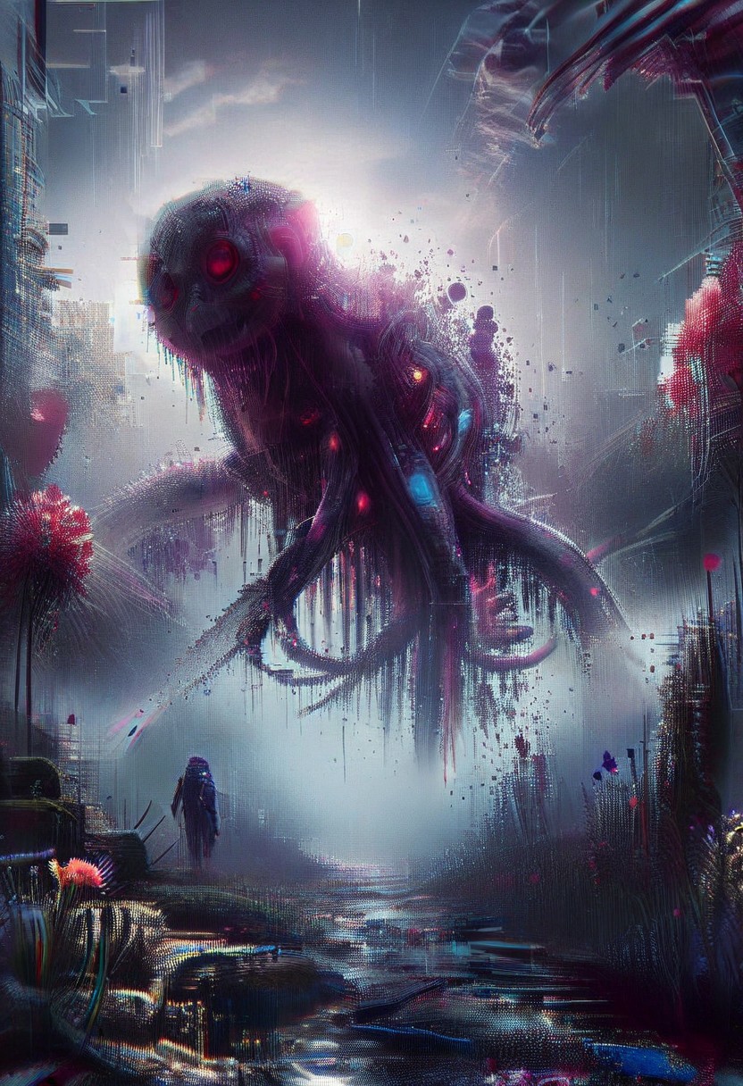A surreal Delirium style digital artwork in a hyper-realistic cinematic. still, artistic. (elaborate fine details:1.1), (hyper-detailed:1.1), (intricate details:1.0), (Refined details:1.1), (best quality:1.1), (high resolution:1.2), (saturated colors:1.4), qu4ntum, close-up on a silver futuristic quantum cyborg squid. Analog image, the surface of a vibrant world. chaotic flowers. Blue, gold, crimson, and lavender purple geometry. geometric gradients, deep rich silver black and blue colors, foggy atmosphere dehancer and good bloom