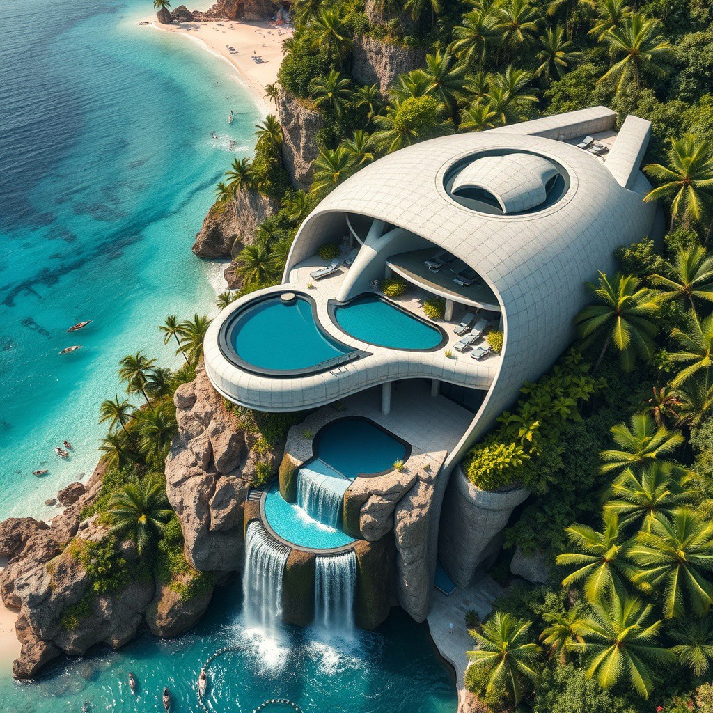 aerial view, A futuristic concrete modern house in a shape of a space ship with swimigpool on a waterfall inspired from a famous architect, with exotic luxuriant vegetation around, in a tropical jungle setting, near a beach, photorealistic, a masterpiece, 4K, high details, view from close, wide lenses camera