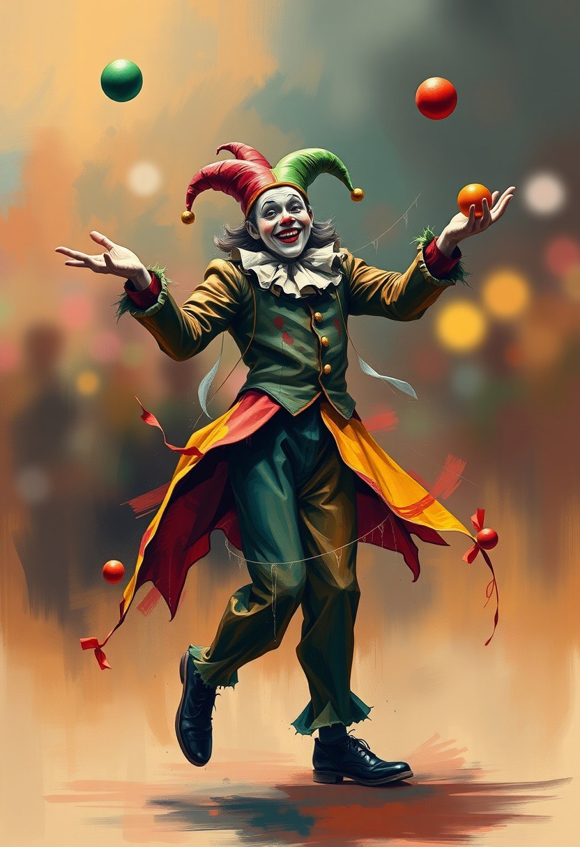 A full-body joyful jester juggling, depicted in abstract expressionism with a blurred bokeh effect and smooth gradient transitions. The piece uses bold brushwork, vibrant colors, layered textures, energetic forms, spontaneous movement, and modernist influences, with seamless color blending and a sharp subject focus.