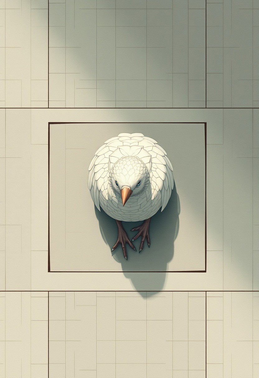 Overhead bird's eye view of a Dodo in Isekai anime style, expressive composition. Minimalist design with soft colors, geometric grids, subtle textures, and precise lines creating a serene and contemplative scene.